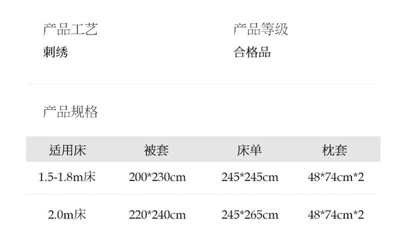 四件套(中号)尺寸(cm):适用的被芯尺寸(cm):230×200