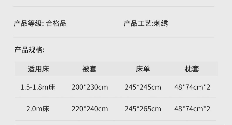 四件套(大号)尺寸(cm):适用的被芯尺寸(cm):240×220