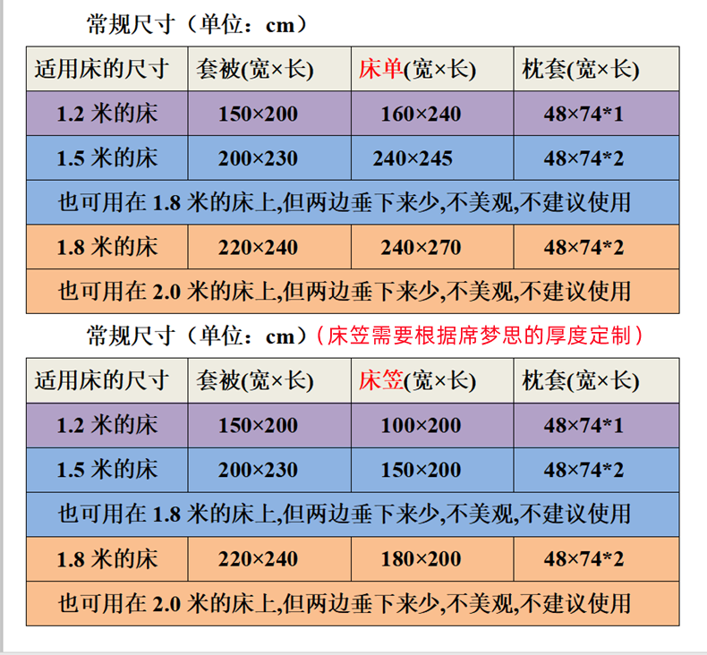 这两个规格一般用在2米×1.5米的床上和2米×1.8米的床上。