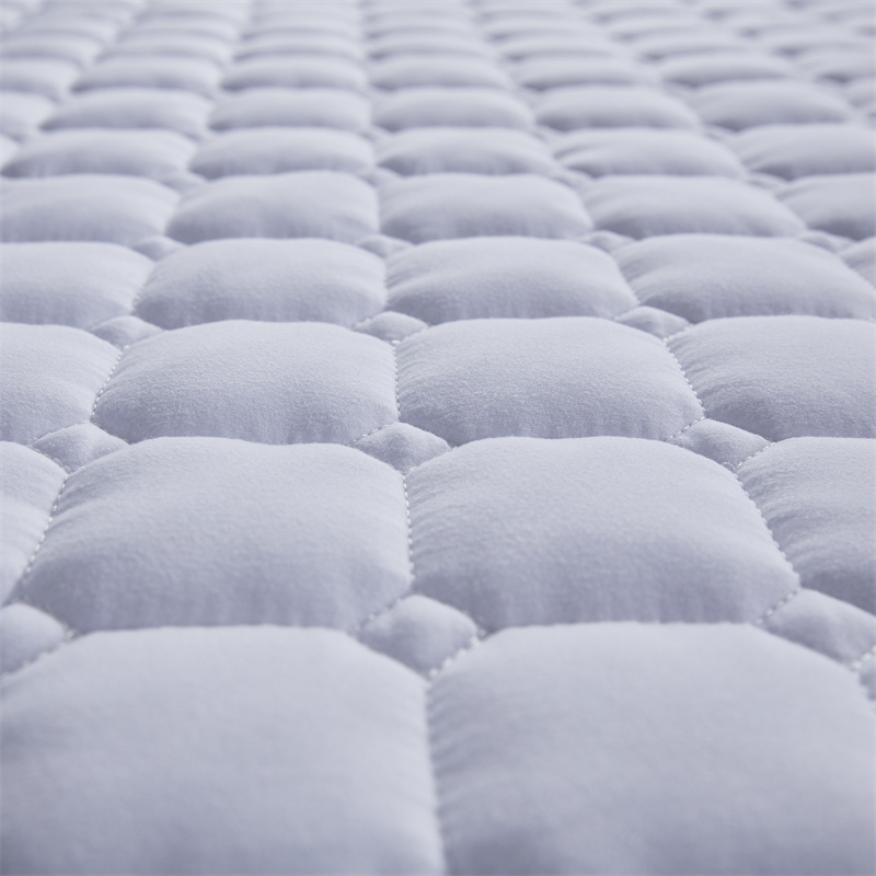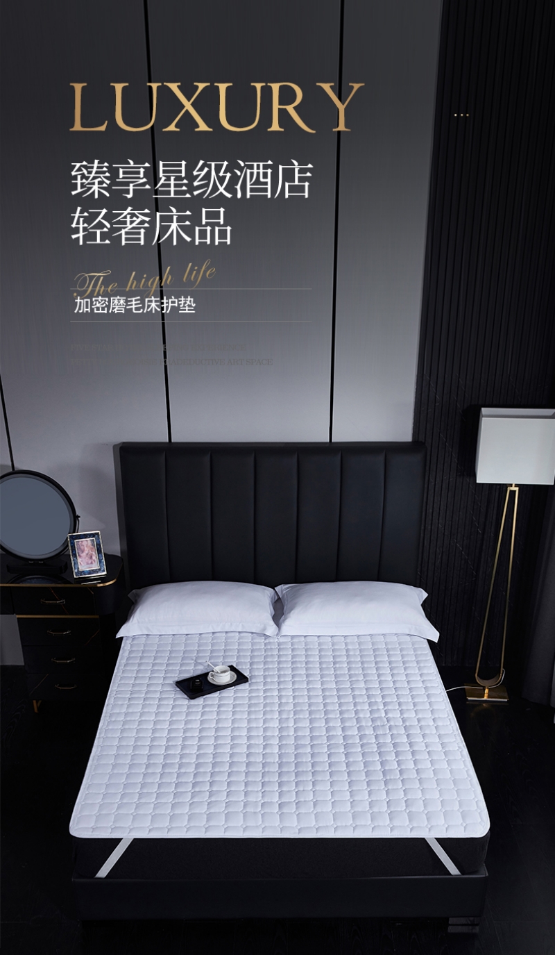 宾馆保护垫大多内芯一般有每平方120克,140克,200克,300克,400克,500克等水洗棉填充,120克,140克的,200克的,经过多次洗涤后会变得非常的薄,不但感觉不舒服,而且不能有效的阻挡污渍,不能很好地保护席梦思。有些宾馆使用多年的席梦思表面会变硬,这是就需要比较厚的保护垫来增加舒适感和保护席梦思。400克以上的比如500克的保护垫有一定的太厚了反而不柔软,而且不要洗涤,400克的加厚保护垫既有一定的厚度保护席梦思又有一定的舒适性,对于用了几年表面有些发硬的席梦思有增加舒适性的作用。保护垫采用多针机绗绣,绗缝的花型间隔只有150px左右,绗缝密度相当地大。所以反复洗涤不会跑棉,本身里面用的是整张水洗棉,经得起强烈水洗。这样的保护垫不但睡着舒适,而且可以有效地阻挡液体污渍渗透到席梦思,很好的保护席梦思。另外,四周是采用同步车包边,既美观又牢固,经得起反复洗涤。400克每平米是水洗棉既经得起洗涤又卫生环保。目前也被广大家庭用户使用。